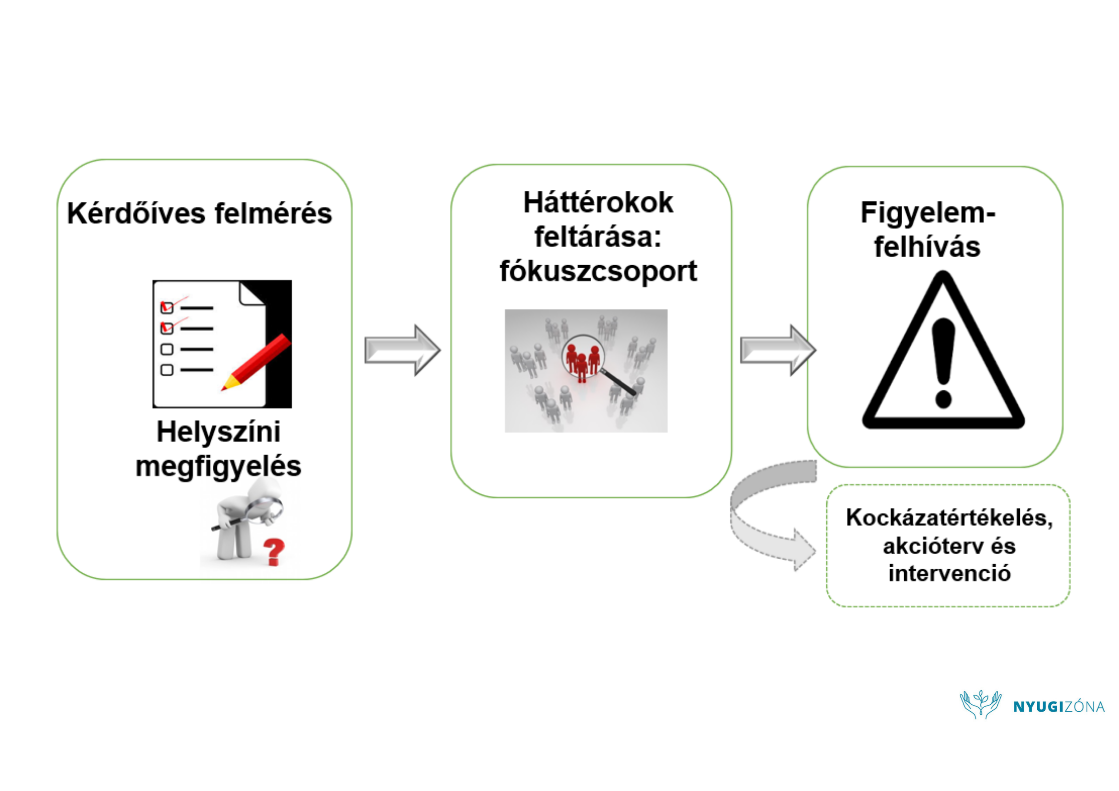 - Fókuszcsoportok segítségével feltárjuk a hátteret: csoportosan beszélünk a dolgozókkal, irányított kérdésekkel feltérképezzük a stresszorok okát, hatásait és összegyűjtjük a munkatársak megoldási javaslatait.